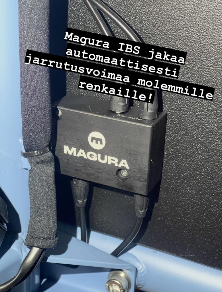 Magura IBS jarrujärjestelmä (lisävaruste) on mielestäni jännittävin juttu tämän vuoden uusitussa Riese&Müller Load5:ssa. Se jakaa jarrutusvoimaa automaattisesti sekä etu- että takapyörälle kun painaa takajarrua. Tiesin että systeemi toimii kesällä hyvin, mutta testailin sitä tänään 2/2026 ensimmäistä kertaa talvella. Ja se toimii paremmin kuin odotin! Eli myös talvella ainakin tämän päivän olosuhteissa olin toimintaan tyytyväinen. Tämä on nimenomaan käytössä pitkissä tavarapyörissä, ja kun painaa takajarrua, niin myös etupyörä jarruttaa. Pelkoni oli ollut, että etupyörä jarruttaisi liukkaalla liian kovaa. Mutta pelkoni oli turha. Koitin jarrutella kaarteissa, kovaa ja hiljaa, ja koitin etsiä lumiselta tieltä jäisiä kohtia eturenkaan alle. Ainakin tämän päivän koeajotilanteessa nappularenkailla pyörän käytös oli hyvin ennustettavaa ja varmaa. Ajan itse myös maastossa, ja jonkin verran myös alamäkiajoa ja koen osaavani jarruttaa hyvin. Mutta Maguran IBS tuntuu tekevän siitä helpompaa. Tällä systeemillä voi tavallisessa ajossa aikalailla unohtaa etujarrun erillisen käyttämisen, ja riittää kun käyttää takajarrua. Systeemi jakaa jarrua juuri sopivasti pyörien välille. Jos painaa kovaa, niin takajarru menee kyllä lukkoon. Jos ihan superkovaa niin molemmatkin menee lukkoon. Mutta Maguran väite siitä että jarrutusmatka lyhenee keskimäärin jopa 40% vaikuttaa olevan ihan kelvollinen väite. Hienoa! Uudessa Loadissa on toki myös nippu muita uutuuksia, kuten GPS paikannus vakiona, hissitolppa ja niin edelleen. Uusittu malli siis yhä säilyttää johtonsa tavarapyörien osalta.