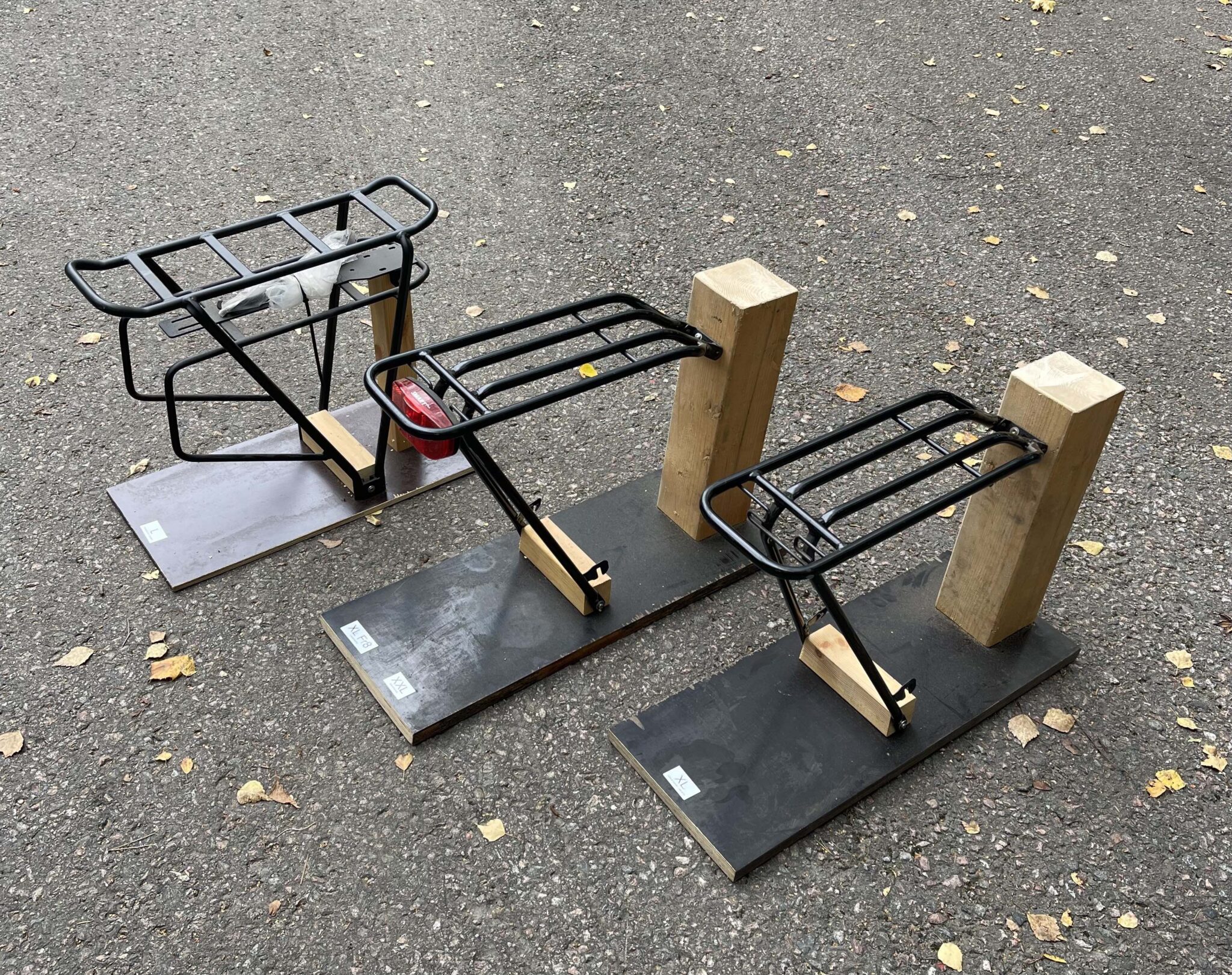 1. Tavarateline Cargobike Long pyörään. Olleet käytössä pyörälaukkujen esittelytelineinä. Vahva ja laadukas teräksinen teline, jossa on paikka takavalolle tai heijastimelle. Sopii oikeastaan vain kyseiseen pyörään. Telineessä ei ole niveliä, joten muihin pyöriin joutuisi vääntämään paksuhkoja teräsputkia tai tekemään sovitteet. Esimerkiksi Cruiser-mallin pyörät toimitetaan normaalisti ilman takatelinettä, joten tässä sopiva teline kyseiseen pyörään.