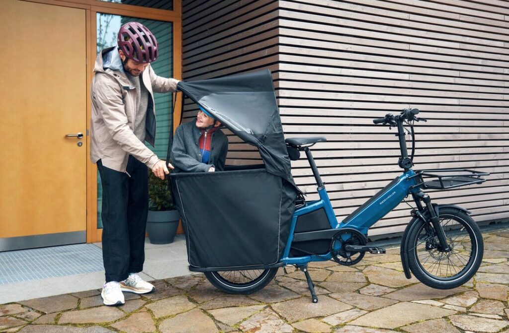 Packsterin kuomu sivulta, yksi viisivuotias kyydissä. Kr8/Cargobiken kuomu on tilavampi ja pidempi. Jälkimmäisiin saa nykyään myös extrakorkeaa kuomua.